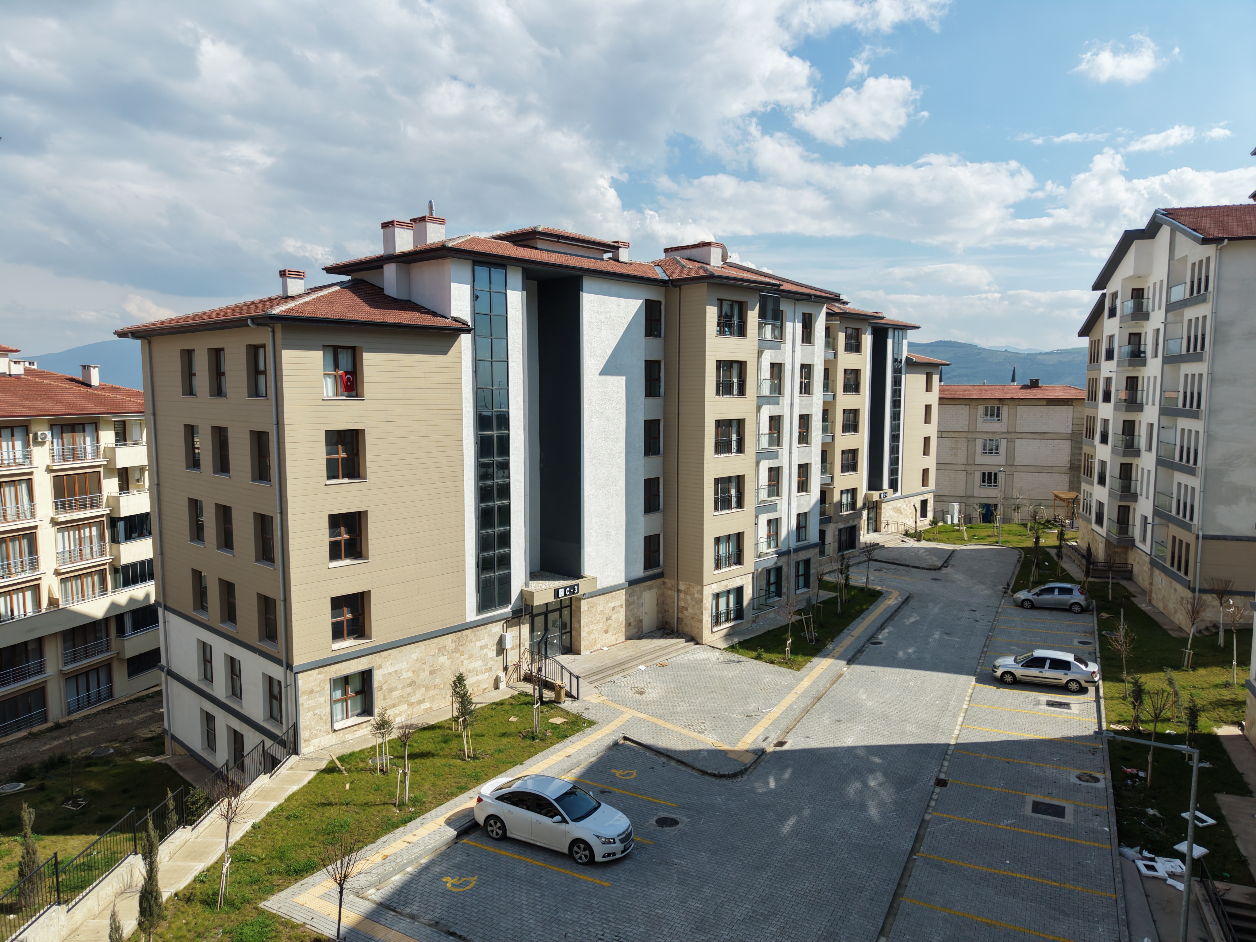 Yatay mimari anlayışıyla yapılan konutlar; radye temel üzerine, tünel kalıp sistemi ile depreme dayanıklı olarak inşa edildi.
