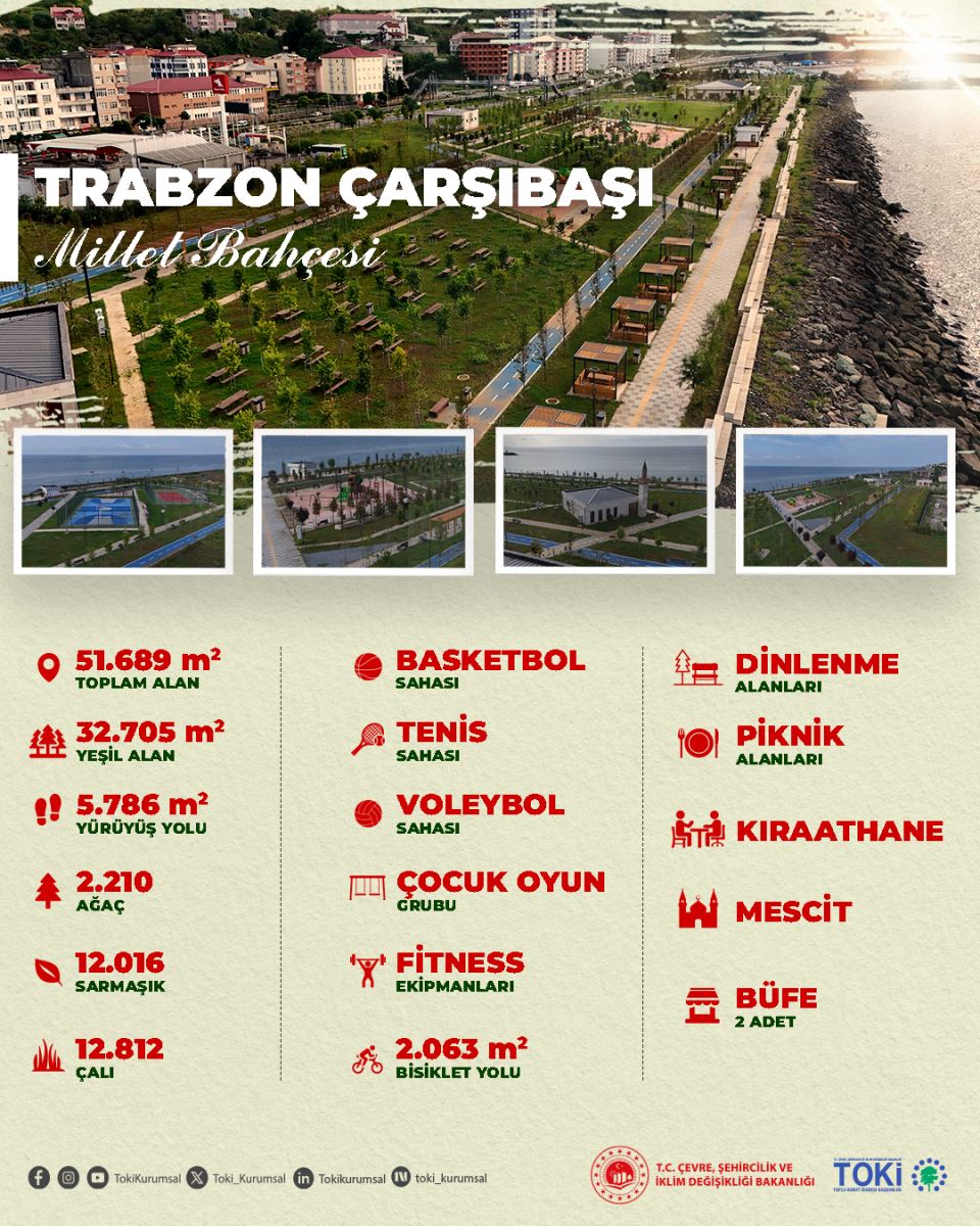 Çevre, Şehircilik ve İklim Değişikliği Bakanlığı, Toplu Konut İdaresi Başkanlığı (TOKİ) tarafından yaklaşık 52 bin metrekarelik alanda yapımı tamamlanan Trabzon Çarşıbaşı Millet Bahçesi, düzenlenen törenle vatandaşların hizmetine açıldı.