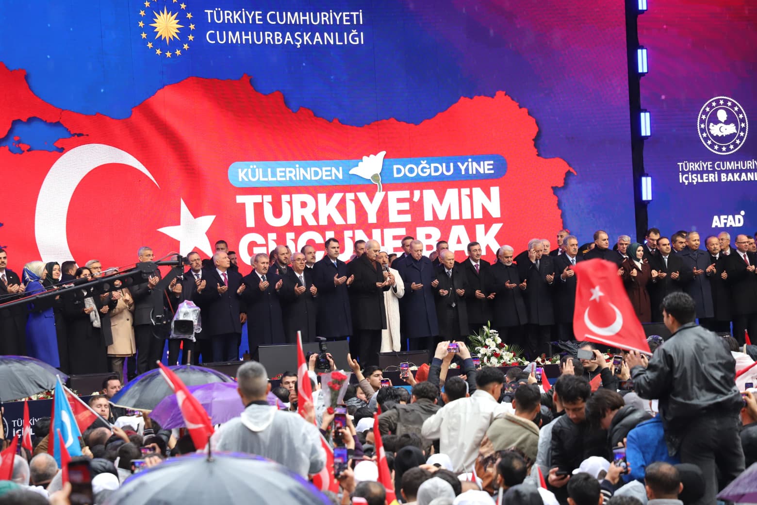 Alanda, deprem bölgesinde son 3 yılda yapılanları anlatan videonun gösterilmesinin ardından Cumhurbaşkanı Erdoğan, "Bütün bunları kardeşlikle, dayanışmayla, paylaşmayla başardık. İnşallah omuz omuza verip çok daha fazlasını yine sizlerle birlikte başaracağız." dedi.