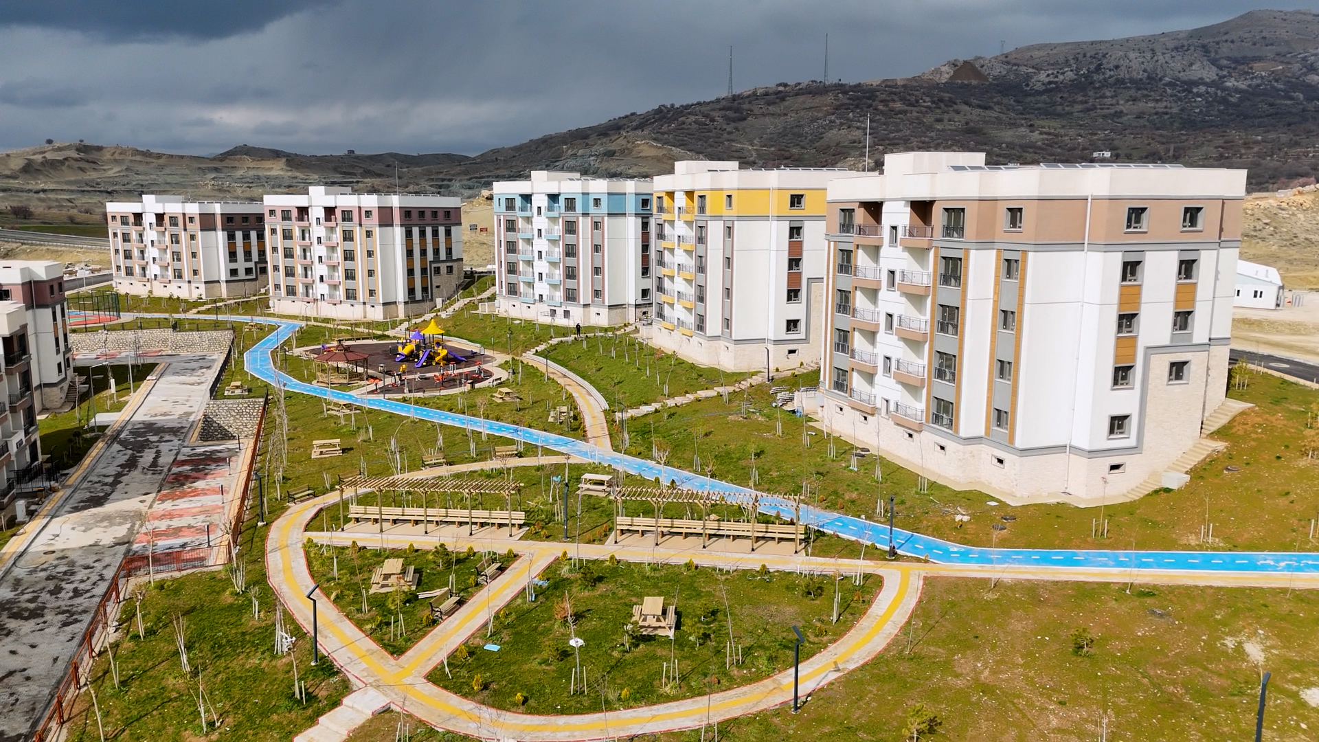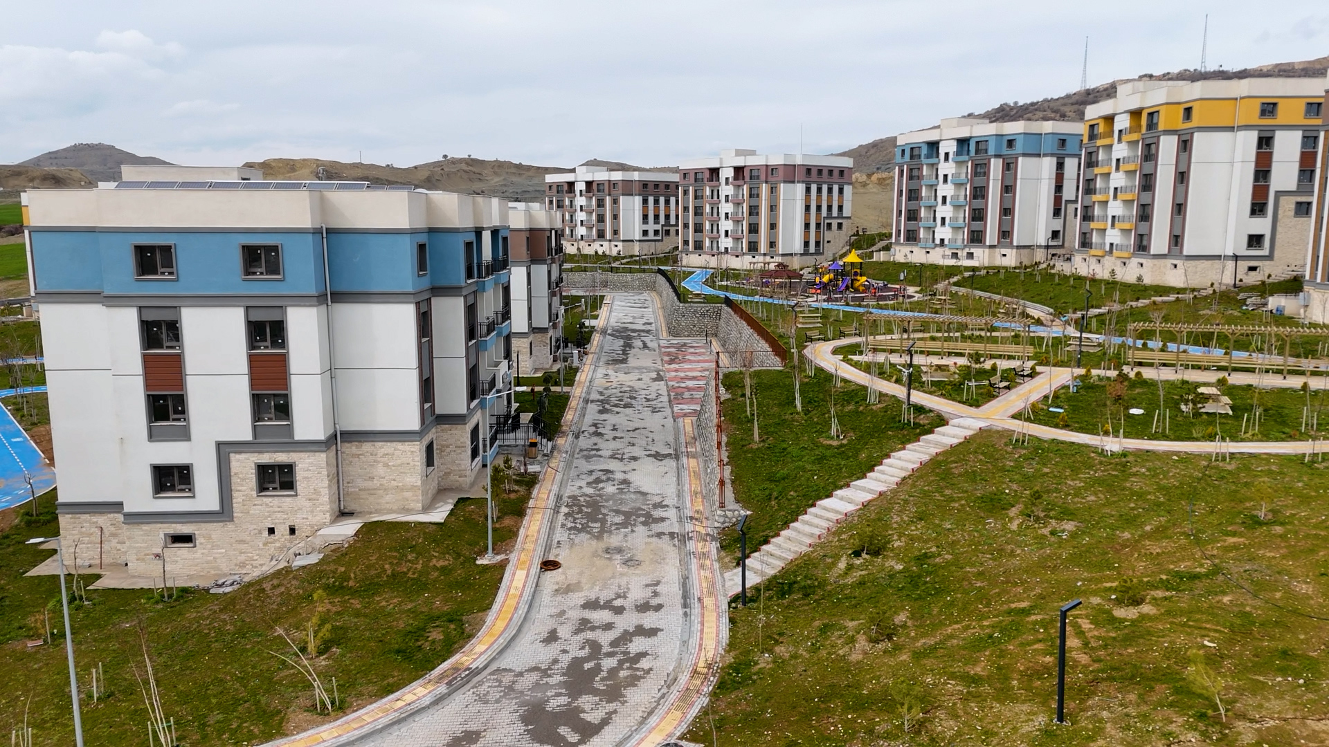Yatay mimari anlayışıyla yapılan konutlar; radye temel üzerine, tünel kalıp sistemi ile depreme dayanıklı olarak inşa edildi.