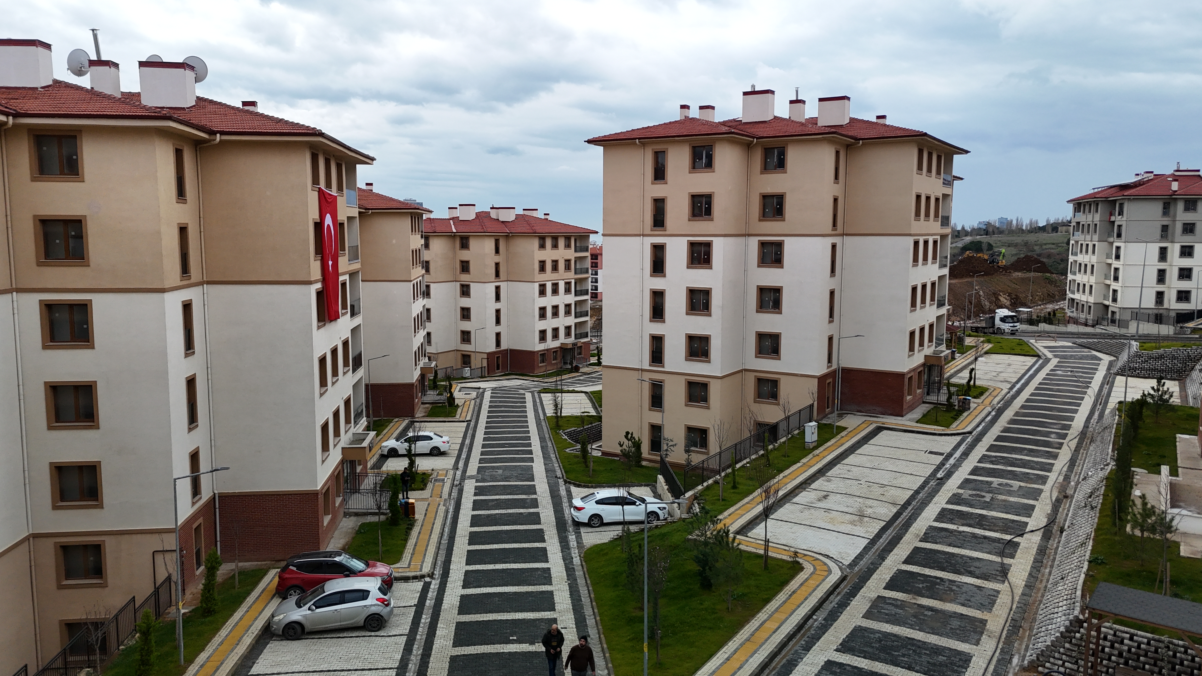 Yatay mimari anlayışıyla yapılan konutlar; radye temel üzerine, tünel kalıp sistemi ile depreme dayanıklı olarak inşa edildi.