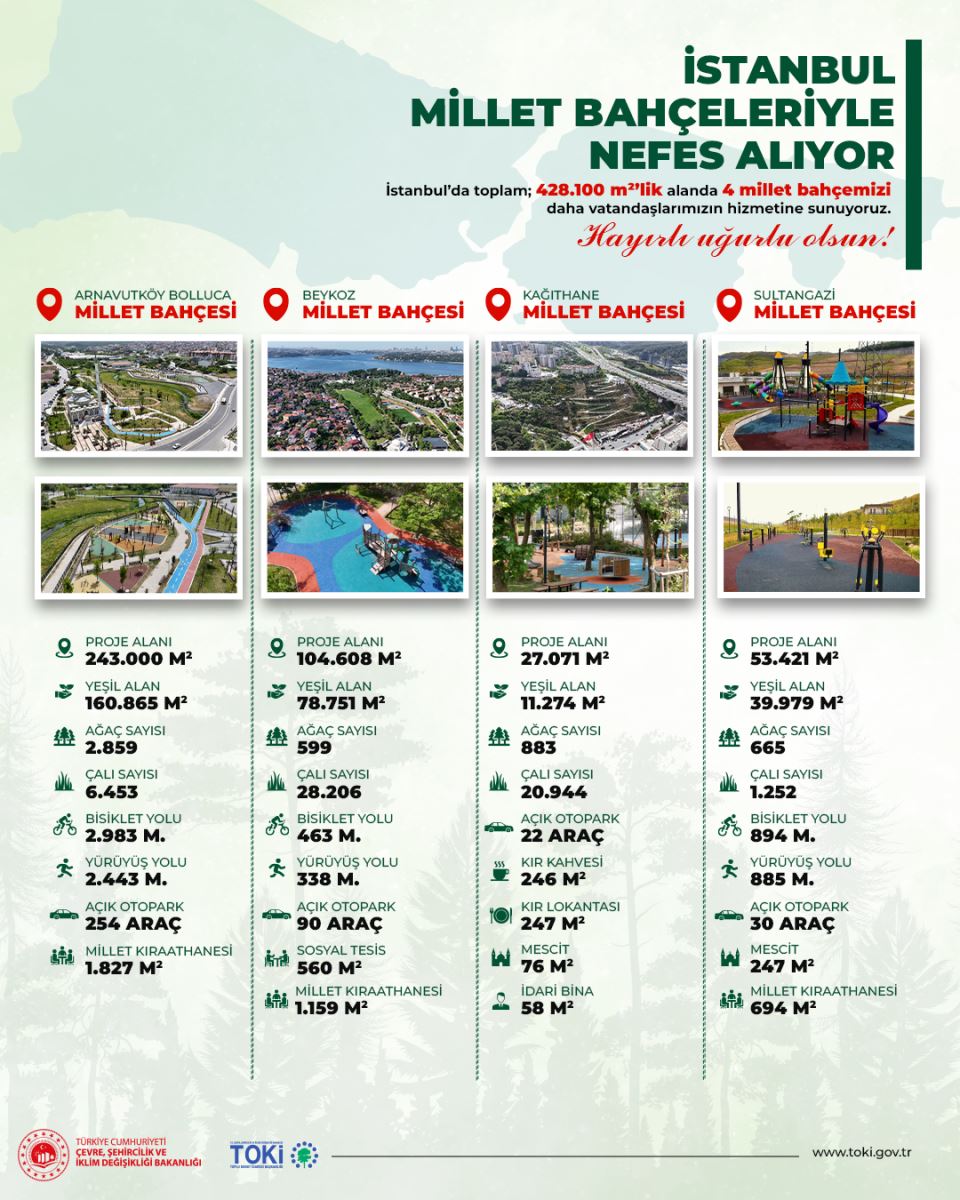 Arnavutköy Millet Bahçesi 243 bin metrekare, Beykoz Millet Bahçesi yaklaşık 105 bin metrekare, Kâğıthane Millet Bahçesi 27 bin 71 metrekare ve Sultangazi Millet Bahçesi ise yaklaşık 54 bin metrekarelik alanda inşası tamamlandı.