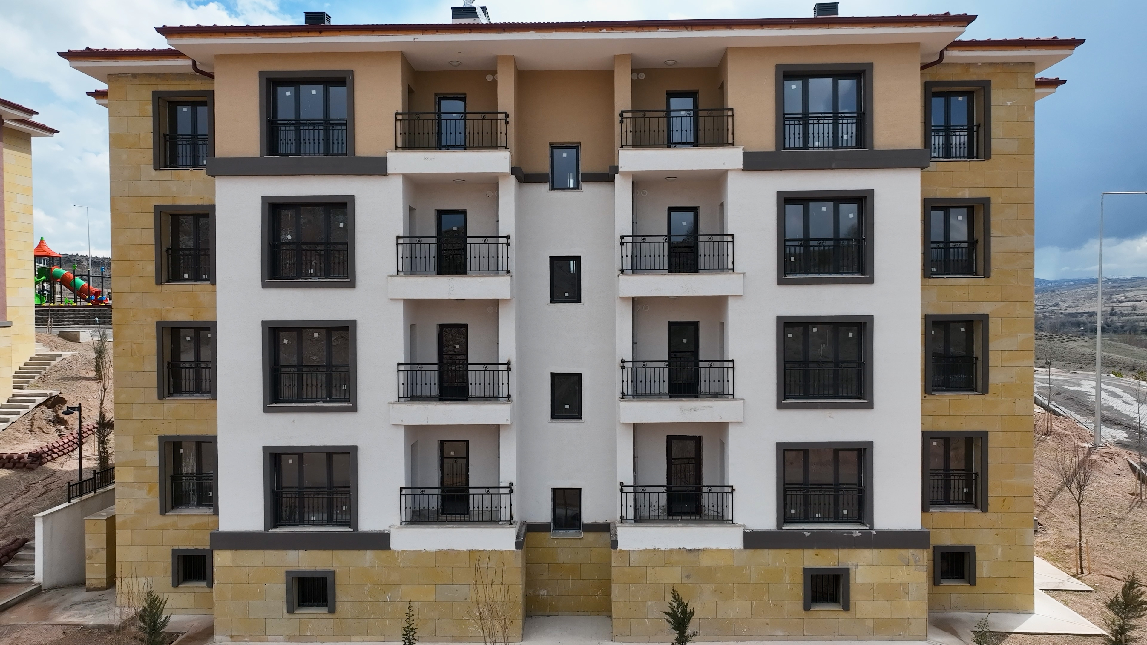 Yatay mimari anlayışıyla yapılan konutlar; radye temel üzerine, tünel kalıp sistemi ile depreme dayanıklı olarak inşa edildi.